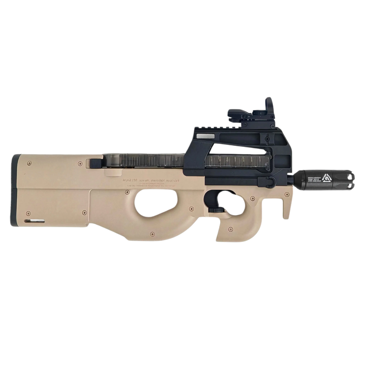Domina el terreno con nuestro P90 eléctrico full-auto equipado con un marcador LED metálico para bolas trazadoras (efecto luminoso espectacular) y una mira incluida para apuntar rápido y certero. Chasis de nylon de alta resistencia, cadencia sostenida, sensaciones premium.